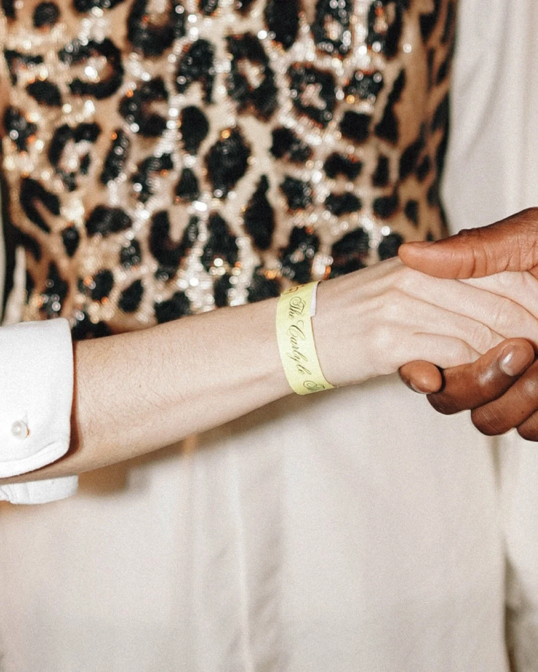 Close-up of two hands holding each other, one hand wearing a wristband and the other with darker skin, against a background of a person's waist wearing a leopard-print and glittery dress.