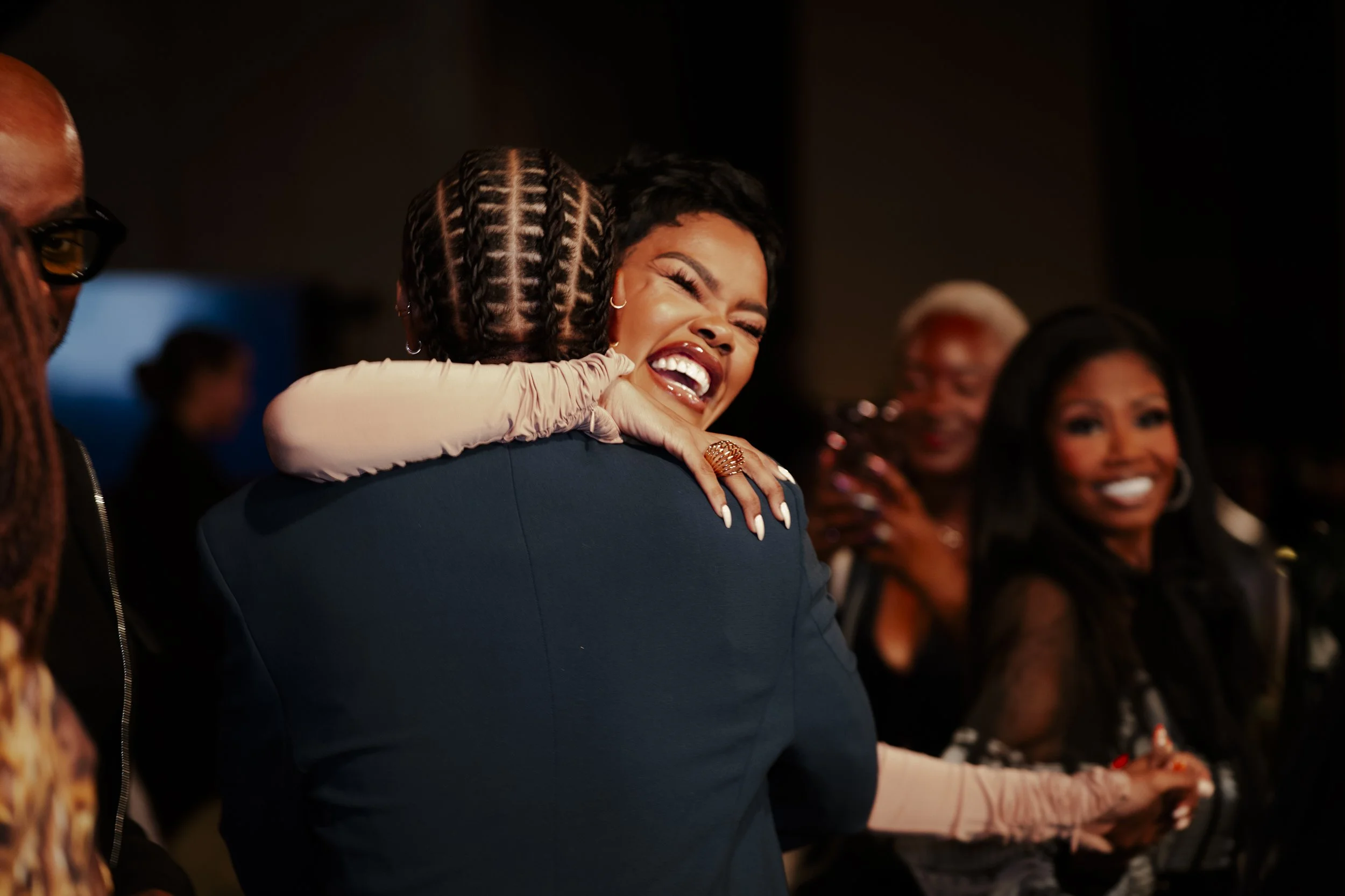 A joyful Teyana Taylor hugging Lena Waithe at an event, with others smiling and capturing the moment.  Photographed By Breanna Nichelle at Essence Black Women In Hollywood Event.