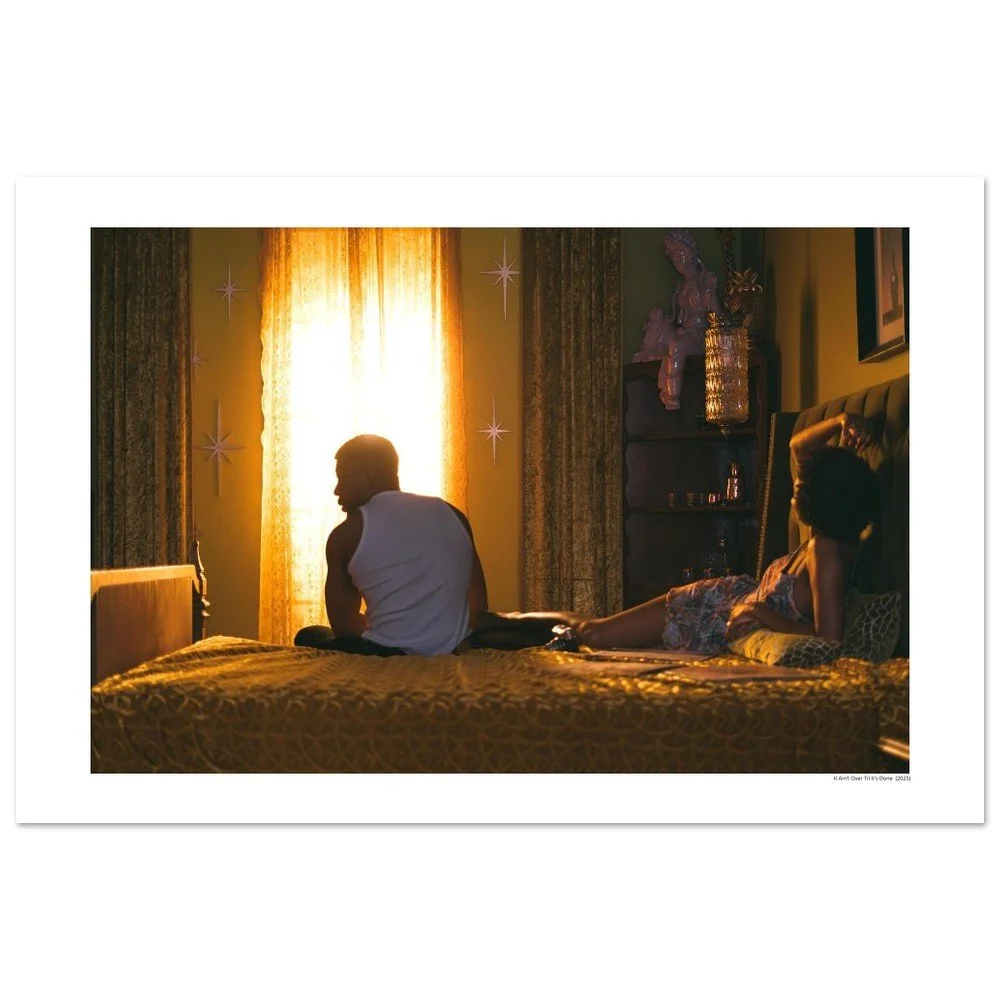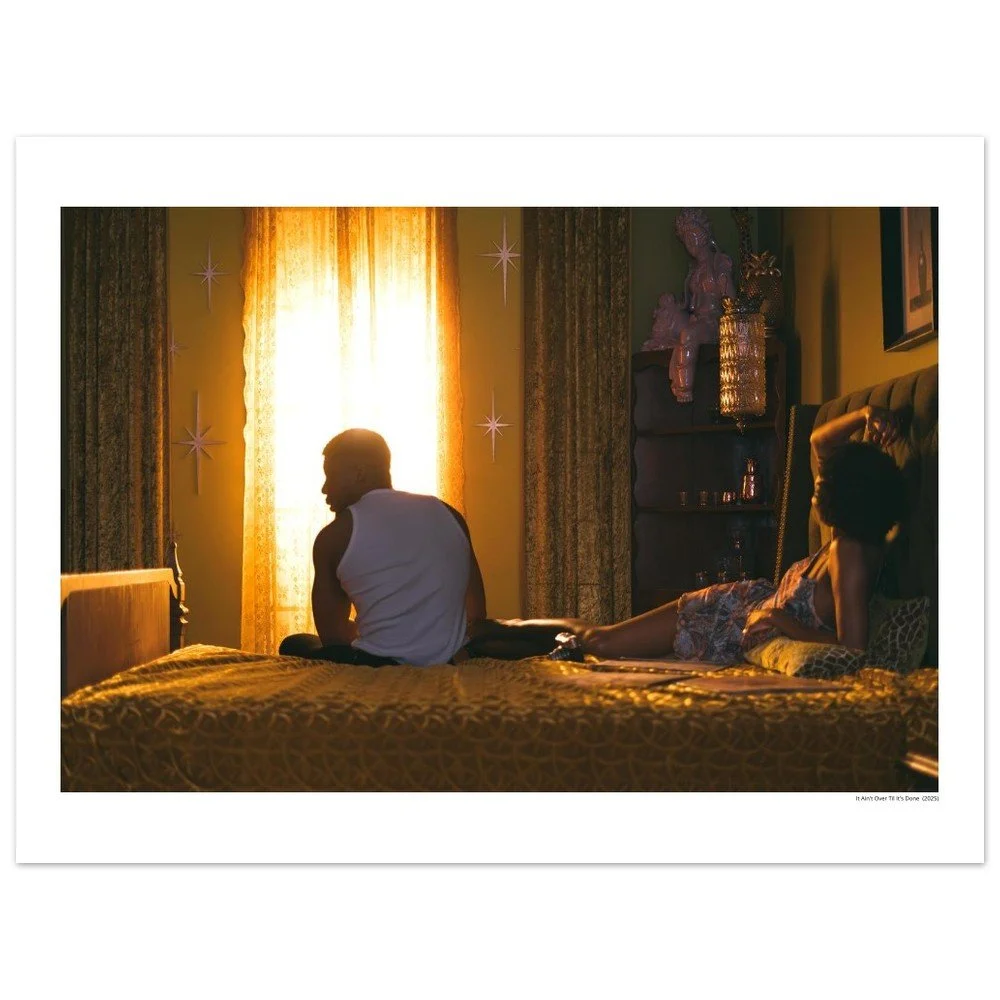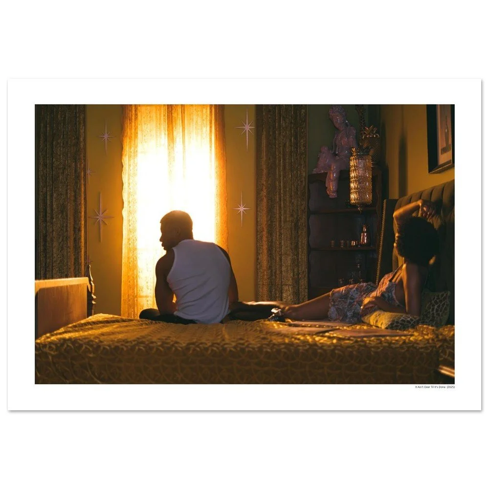 A quiet, golden moment suspended in the almost-morning hush. It Ain’t Over Til It’s Done (2025) captures two bodies sharing a room but drifting in their own constellations of thought. Light spills through the curtain like it’s choosing them on purpose, wrapping everything in that deep, cinematic warmth that turns the ordinary into myth.The scene feels lived-in: soft shadows, a hum of stillness, the gentle weight of connection and distance coexisting in a single frame. It invites you to pause, breathe, and step inside the story, however you choose to imagine it.Photography by Breanna Nichelle.Printed on premium archival paper with museum-quality color depth. Available framed or unframed.